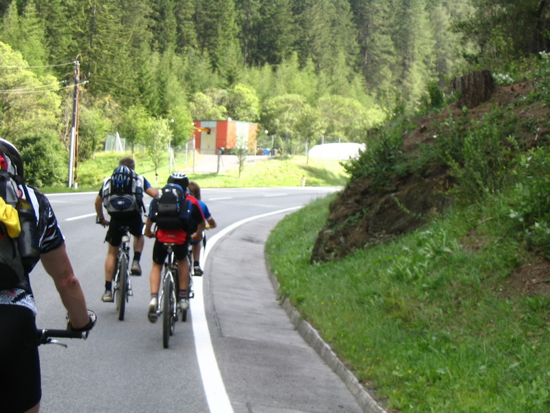 Auf dem folgenden Stück nach Pfunds fuhren wir auf kleinen Asphalt- und Schotterstraßen durch das Tal. Dabei überholten wir einen Vater, der mit seinen beiden 11 und 13 Jahre alten Söhnen ebenfalls auf Alpenüberquerung war. Wir fuhren letztendlich bis Reschen gemeinsam und bestaunten das Durchhaltevermögen des jüngsten. Kurz vor Pfunds war die Straße von der Polizei gesperrt. Alle Autos mussten anhalten und wurden wieder zurückgeschickt. Für uns hatte der nette Polizist aber eine gute Nachricht: Wir durften die Bundesstraße über den Reschenpass benutzen, was der Vater mit den Jungs natürlich gerne annahm. Roger und ich konnten uns natürlich die einmalige Chance, auf der (extra für uns :) gesperrten Passstraße zu fahren, nicht entgehen lassen.
