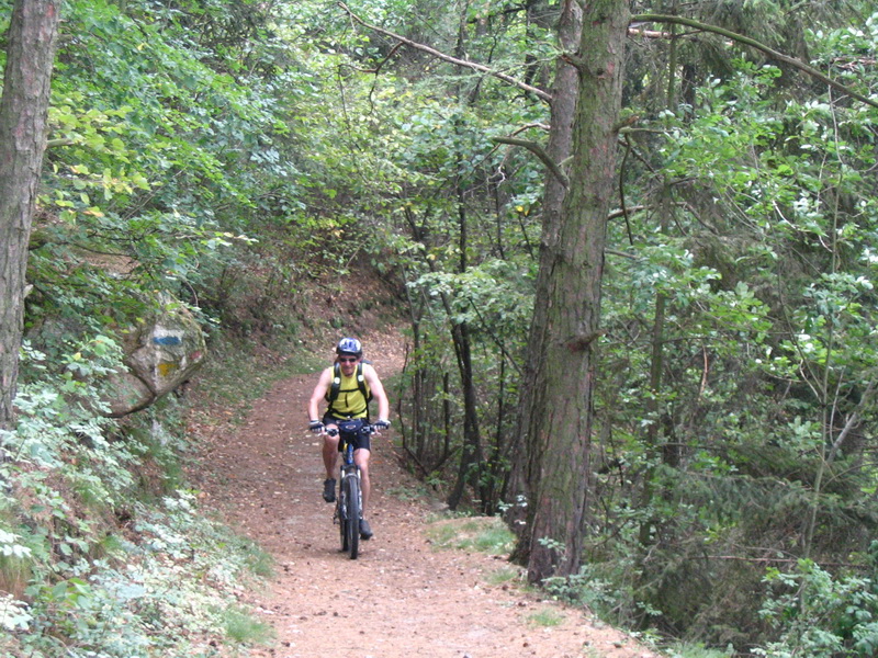 Um etwas Abwechslung in die Asphalt- und Schotterpisten zu bringen, fuhren wir ab Tschirland nach Schloss Dornsberg, einer Burgruine. Hier fanden wir schöne Trails am Waldrand und man glaubt es kaum, hier hatten Roger und ich uns verloren. Aber wofür hat man Handys. Auf einem Trimm dich- Pfad trafen wir uns wieder. In Plaus endeten die Trails und wir kreuzten die Etsch, um bald darauf auf Meran zu blicken. Über die alte Etschstraße rollten wir in die City. Hier suchten wir uns in der Fußgängerzone eine Gelateria und genossen unser Eis, immer die Passanten beobachtend.