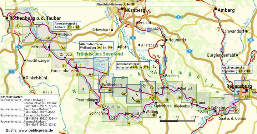 Aus dem Informationsmaterial, dass ich mir von der Zentralen Touristik-Information Naturpark Altmühltal zusenden lies, ging hervor, dass der Weg in Gunzenhausen am Altmühlsee begann und dann über 166 km bis nach Kelheim führt. Ich denke mal, hier gönnen sich zwei Regionen nicht das Meiste! Tatsächlich gibt es ab Rothenburg o.d.T. den Altmühl-Radweg, der über knapp 90 km an dem Altmühl- Entstehungsgebiet bei Hornau vorbei führt und dann der jungen Altmühl bis zum Altmühlsee bei Gunzenhausen folgt. Ab dort ist der Weg dann als Altmühltal-Radweg ausgeschildert.