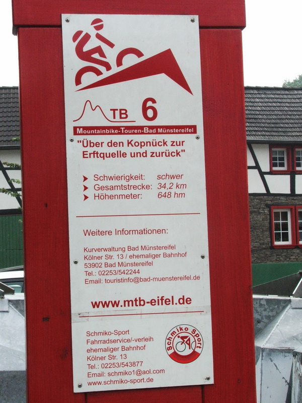 Die Stadt Bad Münstereifel hat speziell für Mountainbiker aber auch für alle interessierten Tourenfahrer ein Radwegenetz mit einer Gesamtlänge von rund 300 km ausgewiesen. 10 Einzeltouren mit Streckenlängen von 18 - 68 km mit unterschiedlichen Schwierigkeitsgraden stellen ein breites Angebot dar. Leichte Streckenvorschläge mit geringem Steigungsanteil sind der ideale Einstieg für den Anfänger und eignen sich auch für Ausflüge mit der ganzen Familie. Wer Höhenmeter machen möchte oder technisch und konditionell anspruchsvolle Touren bevorzugt wird ebenso fündig werden. Auch für Profis ist gesorgt: Eine 68 km lange Powertour mit einer Höhendifferenz von ca. 1200 m wird auch den gut trainierten Biker zum Schwitzen bringen.
