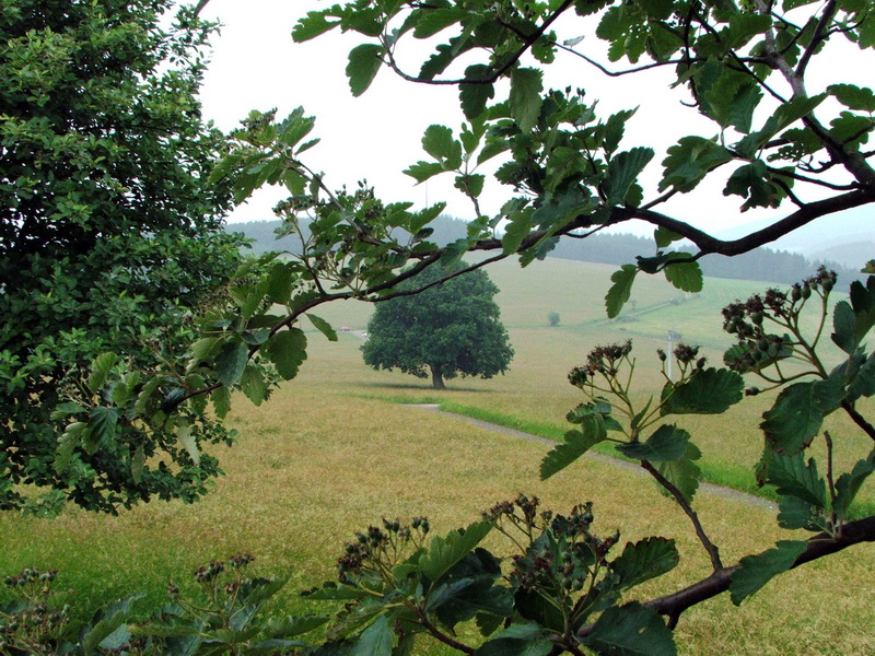 Dann führte mich die Strecke hinauf zum Michelsberg, dem mit 585,3 m höchsten Berg der Gegend. Leider ließ das diesige Wetter den schönen Eifelblick nur erahnen. Von hier fuhr ich über Wiesenwege hinunter zur Wasserscheide von wo es in den Schönauer Wald ging. Nun folgt ein stetiges Auf und Ab bis ich schließlich die Siedlung Vollmert erreichte.