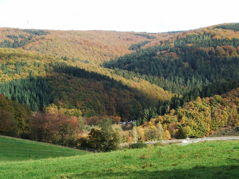 Ich startete diese Tour Anfang Oktober bei herrlichem Sonnenschein am Parkplatz Bodenbachtal. Zunächst wurde am Erft- Hochwasserrückhaltebecken die B 51 überquert. Vorbei an dem Flecken Lingscheiderhof steigt der Weg bis zum Witscheiderhof steil an.