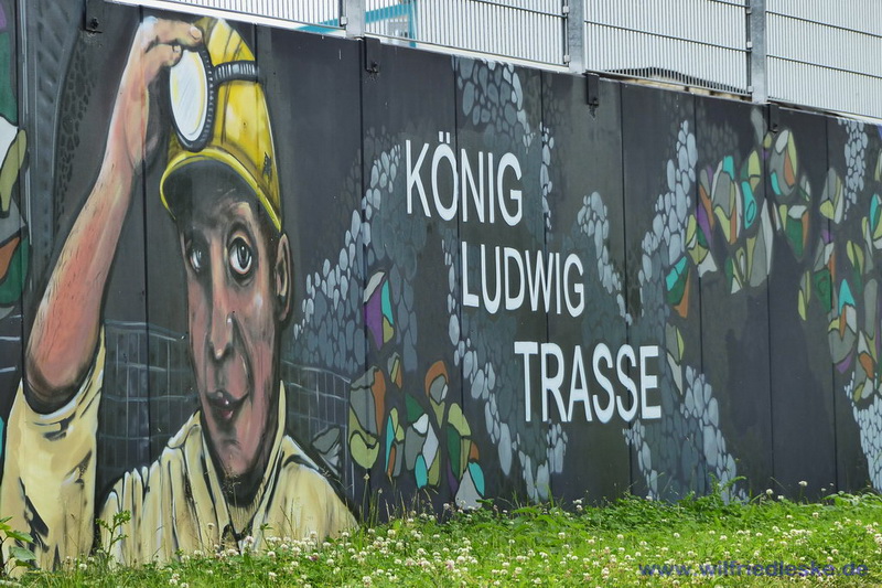 An einer Stelle des Radwegs hat man ein Stück Grubenausbau mit einer original Grubenlokomotive (mit Dieselantrieb) und zwei Loren aufgestellt. Erinnerung an die Bergbaugeschichte. In diesem Bereich wurde die alte Zechenmauer kunstvoll mit Graffitis bemalt, natürlich alles Bergbaumotive. Ein toller Punkt für die Rast während der Radtour.