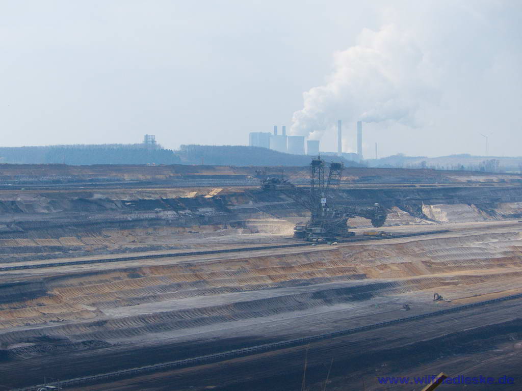 Für größeres Bild bitte klicken!Man sieht rechts die Abraumbagger, wie sie den Boden abtragen und an eine Bandanlage übergeben. Über diese Bänder wird der Abraum um den Tagebau herumtransportiert, bis er auf der andern Seite von Absetzern wieder aufgeschüttet wird. Das ganze geschieht auf mehreren Etagen, bis unten die Kohle freigelegt wird. Auch sie wird mit Schaufelradbaggern auf Bänder geladen und dann direkt zum schon erwähnten Kraftwerk befördert.