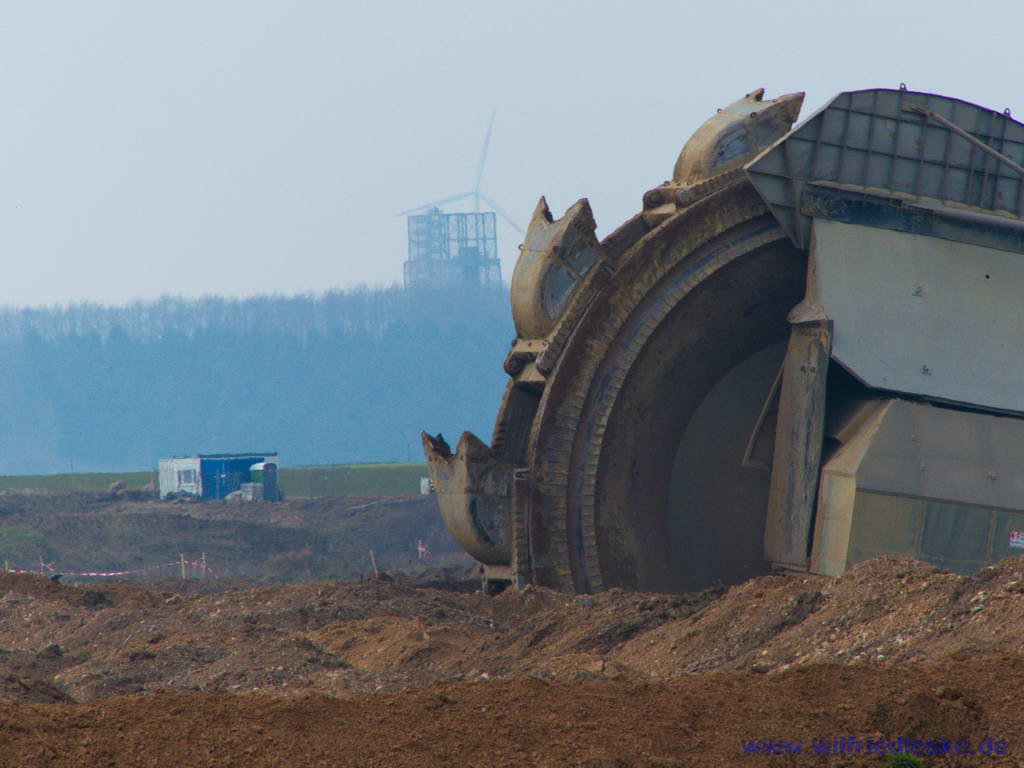 Für größeres Bild bitte klicken!Die Radtour führt weiter über die Grünstraße am Luchterberger See vorbei in die Felder. Jetzt befindet man sich im zukünftigen Abbaugebiet. Überall stehen Brunnen und Pumpen zur Absenkung des Grundwasserspiegels für den Bergbau. Wenn man den Wasserturm von Merken rechtwinklig zur linken Seite sieht (4. Feldweg hinter dem See), sollte man links abbiegen und über den asphaltierten Feldweg direkt auf den Wasserturm zufahren. Die Ortschaft Merken wird geradewegs auf der Andreasstraße durchfahren. Am Ortsausgang (an der Reginastraße) erreicht man den Radweg. Dort geht es nach links in Richtung Schophoven. Der Radweg ist asphaltiert und führt durch Felder weit neben der Landstraße. Kurz vor Schophoven biegt man nach links ab und kreuzt die Landstraße. Jetzt geht es direkt auf den Tagebau zu. Für größeres Bild bitte klicken!Hier befindet sich auch ein neuer Aussichtspunkt. Nun ist man ganz dicht an der Abbaukante. Die Schaufeln des Abraumbaggers drehen sich unermüdlich. Die Ortschaft Pier wurde gerade von ihnen „verschluckt“. Es ist auch bemerkenswert, wie dicht die Abbaukante neben Schophoven verläuft. Das wird bestimmt interessant, wenn sich hier so ca. in 15 Jahren das Ufer des neuen Sees befindet. Wohnen am Wasser!