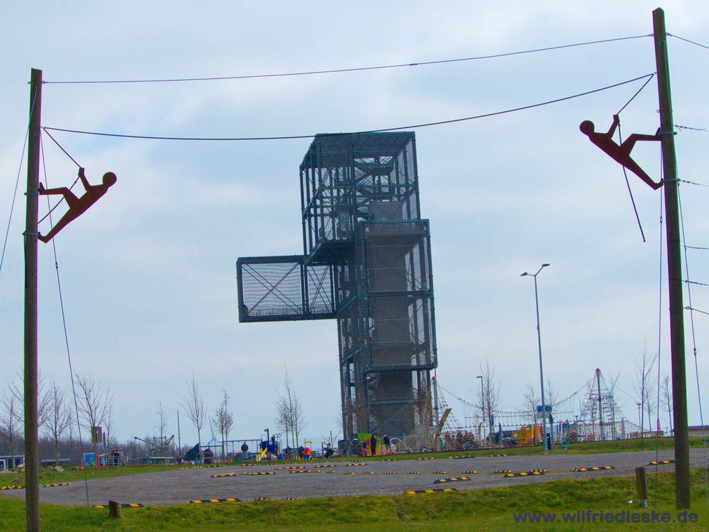 Für größeres Bild bitte klicken!Vom Aussichtpunkt führt die Tour zurück und dann in zwei Serpentinen über eine 900m lange Straße hoch auf die Goltsteinkuppel. Dies ist der einzig längere Anstieg, aber auch für den ungeübten Radler sehr gut zu fahren. Dann steht er vor einem: der Indemann. Dabei handelt es sich um einen 36 m hohen Aussichtsturm. Seine Konstruktion besteht aus 280 t Stahl mit 20.000 Einzelteilen. Für größeres Bild bitte klicken!Ein Edelstahlgewebe umschließt die Konstruktion. 40.655 Leuchtdioden lassen den Indemann bei Nacht zum leuchtenden Symbol des Indelandes werden. Natürlich sollte man über die 216 Stufen und die zwölf verschiedenen Ebenen die Aussicht genießen. (Zu bestimmten Zeiten fährt ein Aufzug bis auf 24 m hinauf.) Infotafeln erläutern das Umland und den nach Abbauende geplanten Indesee.