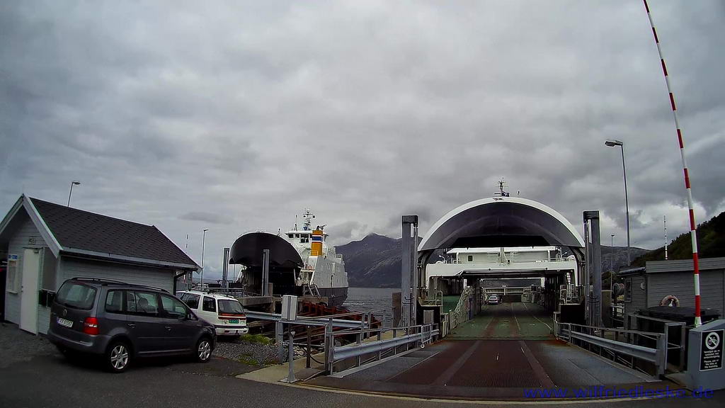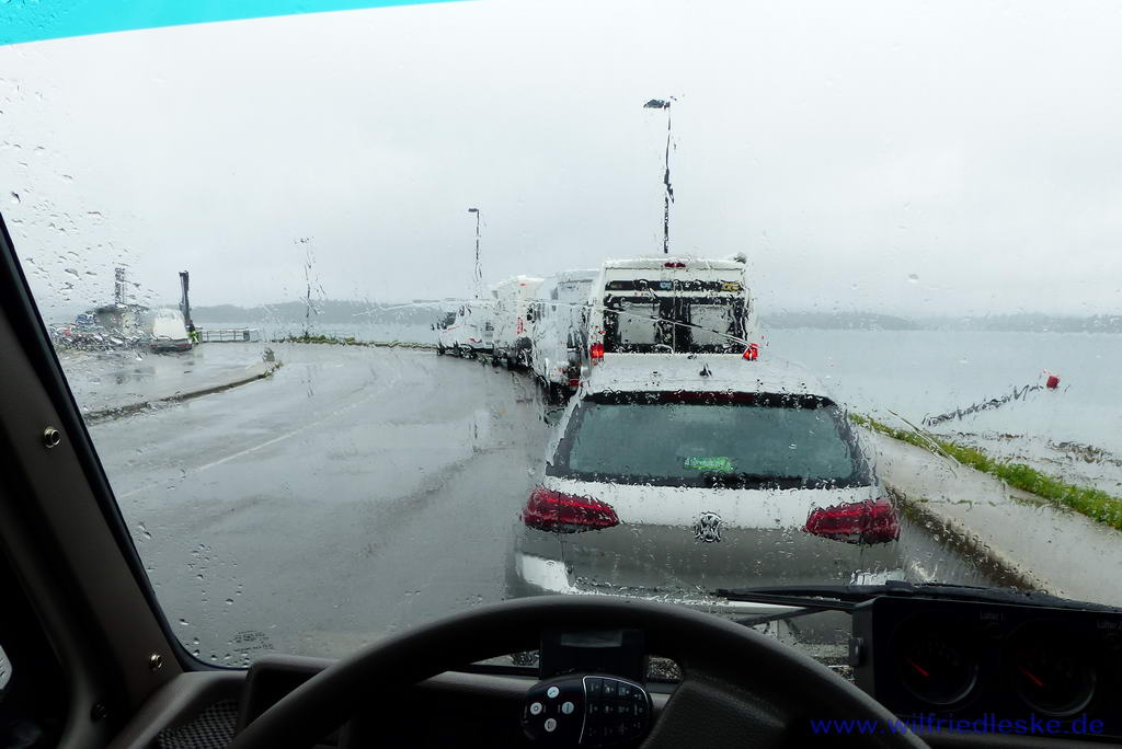 Die Pfahlhäuser haben wir aber nur von außen gesehen, da es die ganze Zeit regnete und wir auch keinen Parkplatz für unser Wohnmobil fanden. Je näher wir zu Küste kamen, desto gewagter waren die Bauwerke. Besonders interessant war bei Foldereid eine Brücke hoch über einen Fjord, die unmittelbar in einem Tunnel endete. Kurz danach erreichten wir in Holm den ersten Fährhafen unserer Route. Hier kauften wir uns zunächst die Ferjekort. Damit sollten sich die Fährkosten für uns deutlich reduzieren.