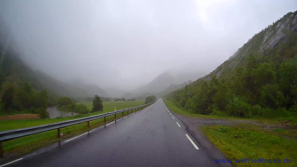 Im Grunde regnete es heute den ganzen Tag. Da es der 23. Juni und damit Mitsommer war, taten uns die Norweger leid, die sich für des Abend auf ein Fest am Lagerfeuer gefreut haben. Als wir am Holandsfjord vorbeikamen, konnten wir noch nicht einmal die Engabreen- Gletscherzunge sehen. Alles lag im Nebel. Dabei hätte ich zu gerne gesehen, wie sich der Gletscher in den letzten 10 Jahren verändert hat. Müssen wir als noch einmal wiederkommen!