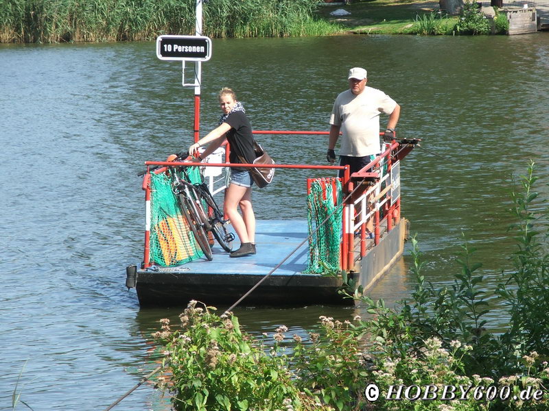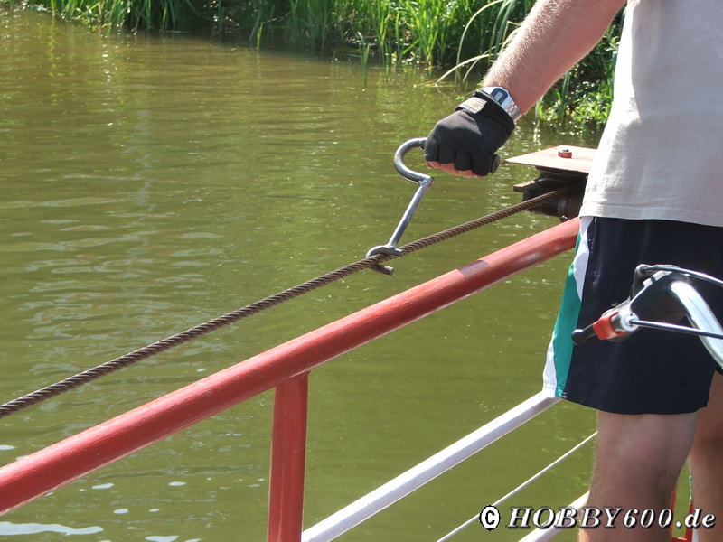 Bei Leißnitz mussten wir die Spree mit der einzigen Handseilzugfähre Brandenburgs überqueren. Für 2 € pro Person brachte uns der Fährmann mit Hilfe eines Hakens an das andere Ufer – einfachste Technik!