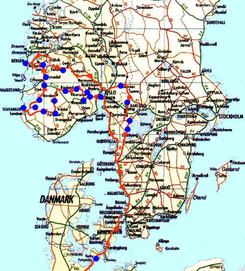 Der Schwerpunkt der Skandinavientour 2000 war Südwest- Norwegen. Hauptziel war das Gebiet zwischen Stavanger und Bergen. Die Tour ist auf der nebenstehenden Karte eingezeichnet und weiter unten auf dieser Seite in einer Tabelle zusammengefasst.