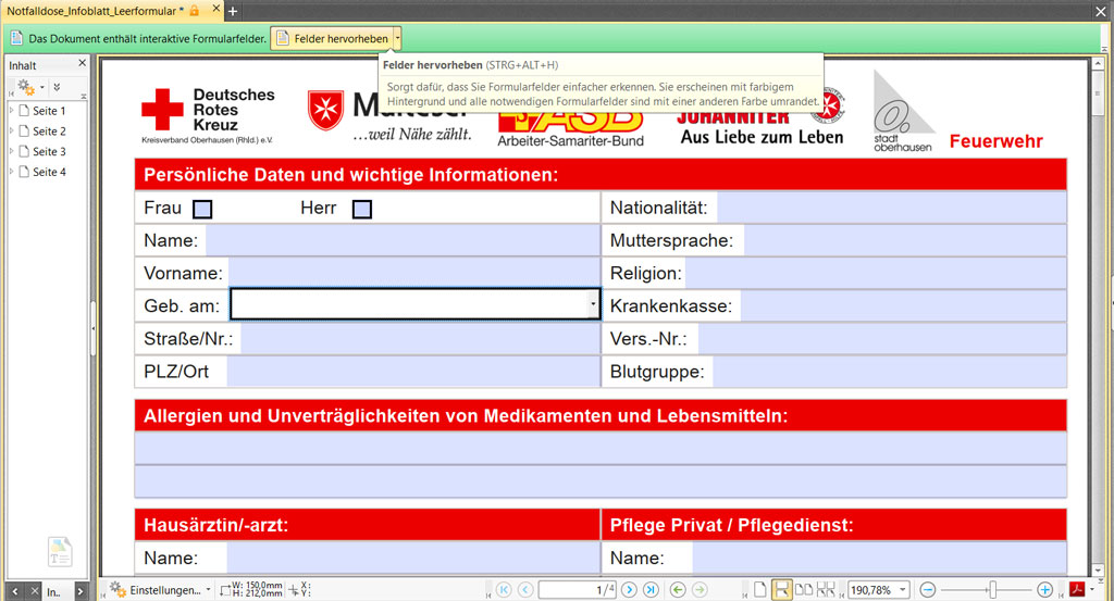 Ich habe mir deshalb das – wie ich meine - sehr gute Infoblatt verschiedener Organisationen aus Oberhausen heruntergeladen und als pdf-Formular umgearbeitet. So lässt sich das Infoblatt mit einem pdf-Reader, der die Formulareingabe zulässt, bequem und leserlich am PC ausfüllen und anschließend ausdrucken. Gleichzeitig sind mehrere Kopien und auch eine elektronische Version zum speichern auf dem Handy möglich. So hat man alle wichtigen Informationen immer greifbar bzw. verfügbar.