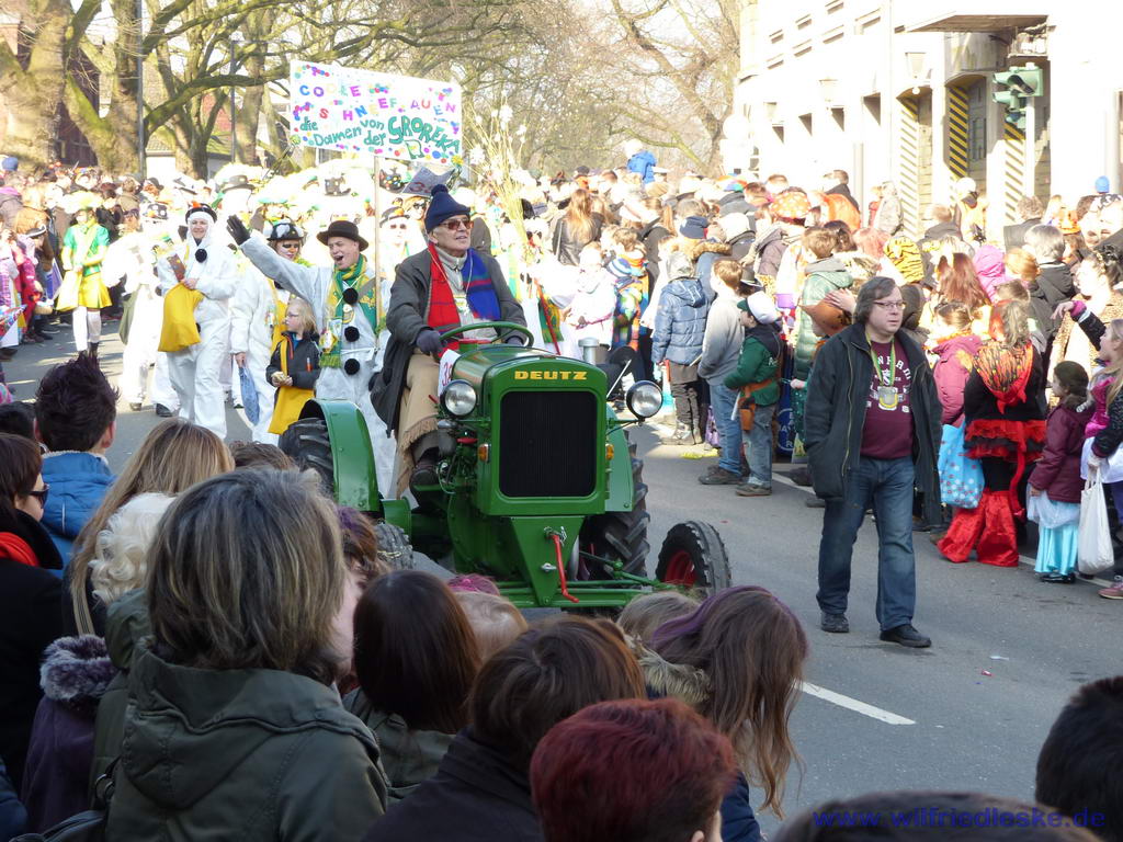 So wurde Helmut im Jahr 2013 von der GroReKa (Große Recklinghäuser Karnevals Gesellschaft Grün-Gold e.V.) angesprochen, ob er mit seinem Grün-Gelben Traktor beim Rosenmontagszug nicht einen Wagen ziehen könne. Natürlich sagte Helmut zu und machte sich am Rosenmontag 2014 auf den Weg von Stuckenbusch in die Altstadt, wo der Zug zusammengestellt wurde. Nur leider ging dem Oldtimer auf dem Weg dorthin die Luft bzw. der Kraftstoff aus. Nicht das Helmut vergessen hatte zu tanken, nein, die Kraftstoffleitung war verstopft.